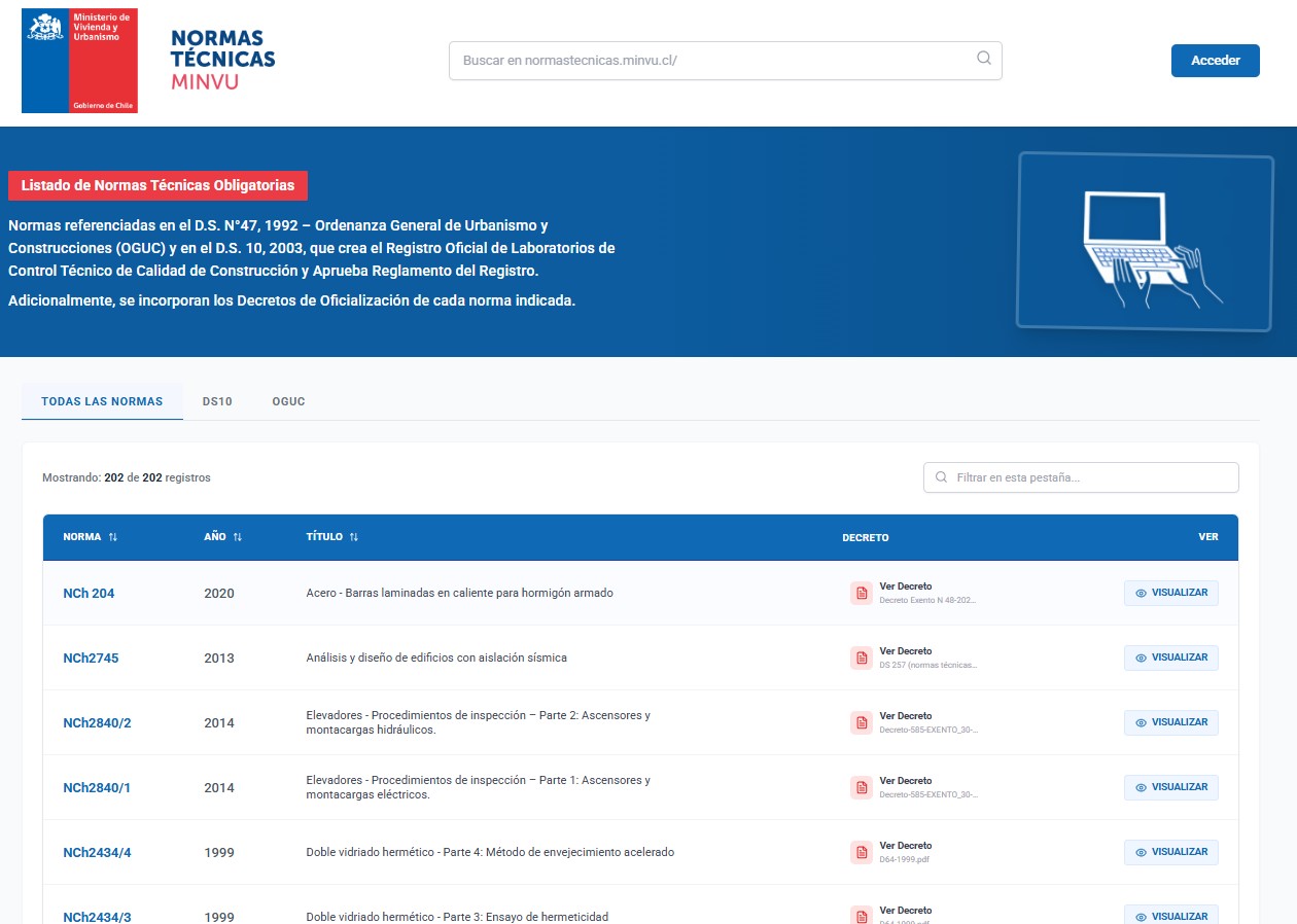El sitio consolida las normas referenciadas en el Decreto Supremo N°47 de 1992, que aprueba la Ordenanza General de Urbanismo y Construcciones (OGUC), y en el Decreto Supremo N°10 de 2003, que crea el Registro Oficial de Laboratorios de Control Técnico de Calidad de la Construcción, junto con su reglamento y las resoluciones que establecen los ensayos mínimos obligatorios para el control de materiales. Además, incorpora, de forma destacada, los decretos de oficialización de cada norma, elemento clave para determinar su carácter obligatorio y la fecha de entrada en vigor.